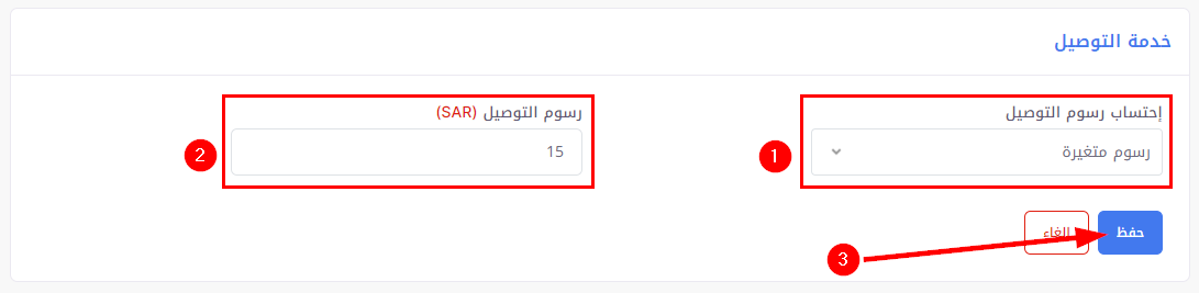 إن اختيار نوع الرسوم المتغيرة لخدمات التوصيل الخاصة بك سيسمح لك فقط بإدخال رسوم التوصيل كما هو موضح بالرقم (2) في لقطة الشاشة أدناه. ثم عليك حفظ التغييرات كما هو موضح بالرقم (3)